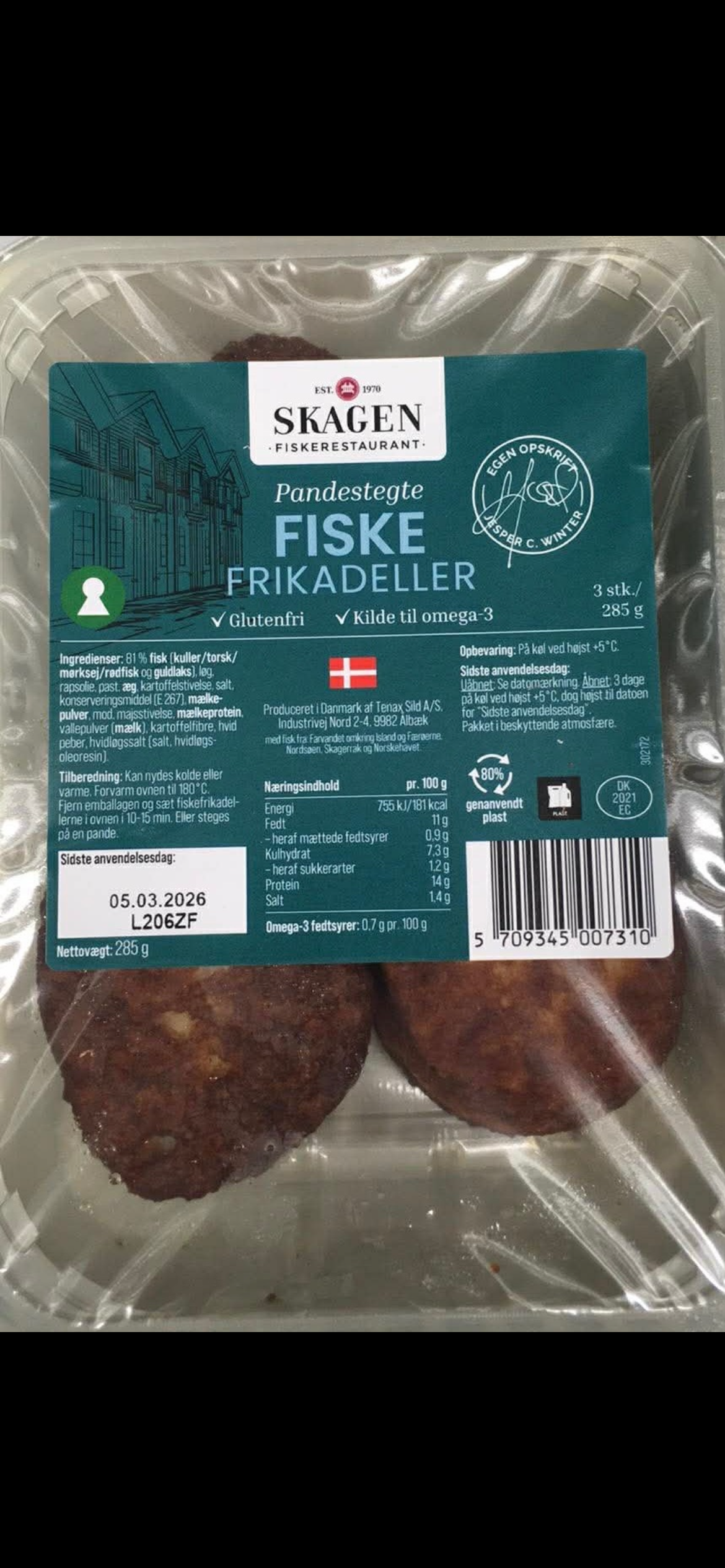 57 % FISKEKØD, 11% hakket løg, 9% kartoffelstivelse, 7% HVEDERASP, 6% vand, 3% mælkepulver, 2% kartoffelfibre, VALLEPULVER, salt, krydderier. Stegt i rapsolie. Vacuumpakket.